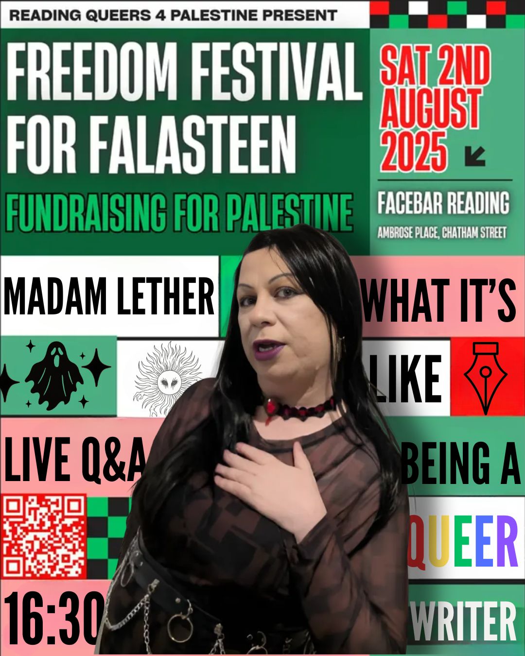 The live event took place at Facebar, Ambrose Place, Chatham Street, Reading, on Saturday 2nd August 2025, as part of Freedom Festival for Falesteen. Madam Lether appeared as a featured speaker and reader, with the programme explicitly positioning her as a queer writer and centring lived experience, authorship, and craft. Her slot combined a live reading with an on-stage Q&A, offering the audience direct engagement with both her work and her thinking around writing, genre, and identity. Structurally and visually, the event framed her not simply as a performer, but as a developing literary voice being introduced to a wider public in real time.